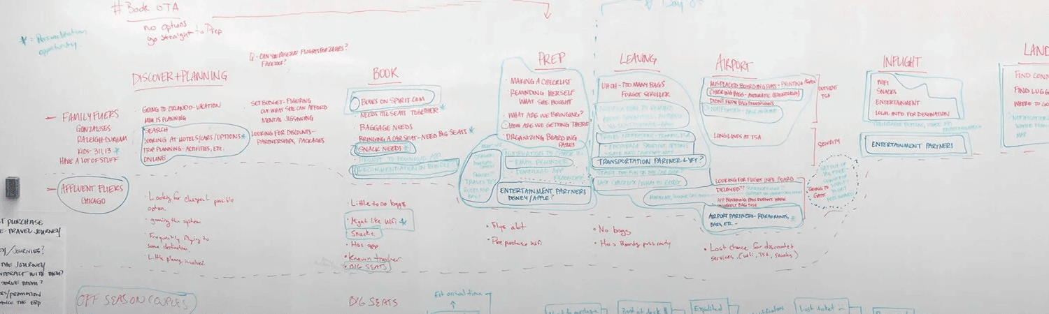 We began by identifying key personas and mapping how their experiences differ when flying with Spirit. As common pain points arose, we were able to condense our narrative to a single storyline and start ideating solutions leveraging some newer tech and dynamic data intake.